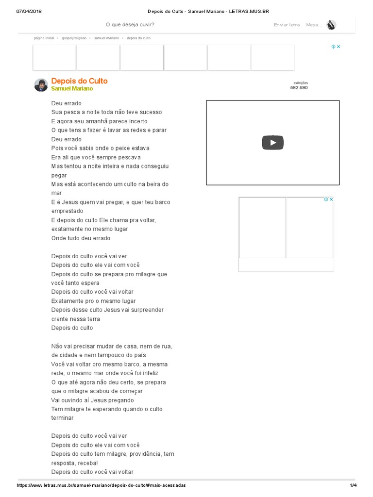 Provided to YouTube by ONErpmDepois do Culto Samuel Mariano Samuel MarianoDepois do Culto Samusic ProduçõesReleased on. Depois do CultoSamuel MarianoLETRA Deu erradoSua pesca a noite toda não teve sucessoE agora seu amanhã parece incertoO que tens a fazer é lavar as redes e pa. Depois do culto se prepara para o milagre que você tanto espera.