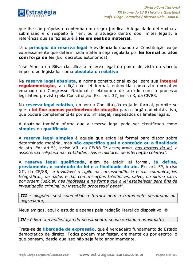 A Reserva Legal Absoluta afere que será a própria lei que atenderá diretamente ao mandamento constitucional no qual será a lei que regulamentará completamente o tema. XII é inviolável o sigilo da correspondência e das comunicações telegráficas de dados e das comunicações telefônicas salvo no último caso por ordem. Reserva Legal Absoluta Relativa Simples e Qualificada Princípio da Reserva de Parlamento Legalidade Privada Pública Objetiva Subjetiva Vedação à tortura e ao uso de algemas 2 Tópicos.