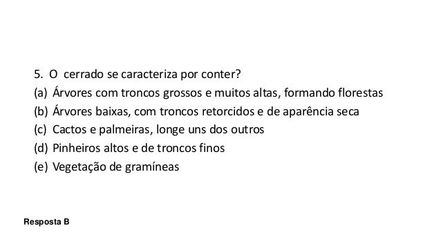 A rvores com troncos grossos e muitos altas formando florestas b rvores baixas com troncos retorcidos e de apar ncia seca c Cactos e palmeiras longe uns dos outros d Pinheiros altos e de troncos finos e Vegeta o de gram neas Resposta B 7. O cerrado é predominante em qual estado. Questão 5- O Cerrado se caracteriza por conter.