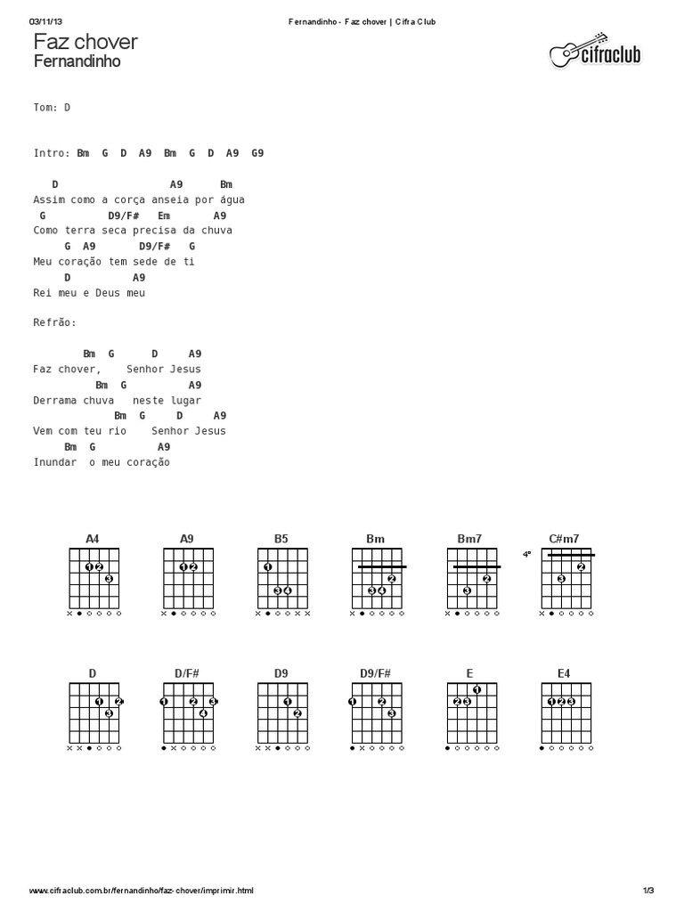 Intro 3x Bm G D A D Assim como a corça A Bm Anseia por águas G D Como terra seca Em A Precisa da chuva G A D G Meu coração tem sede de ti D A Rei meu e Deus meu. Nessa aula de violão vamos aprender como tocar Faz Chover do Fernandinho no Violão. Eu vejo uma pequena nuvem Do tamanho da mão de um homem Mas este é o.