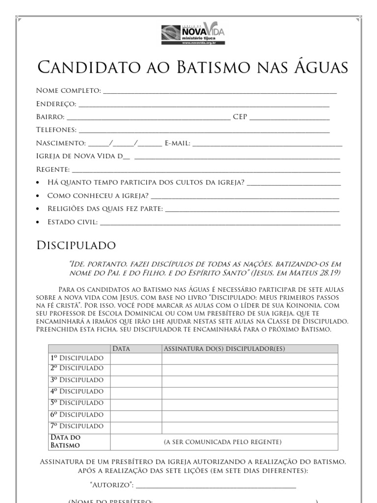 Ficha De Candidatos Ao Batismo Pdf Batismo Igreja Crista