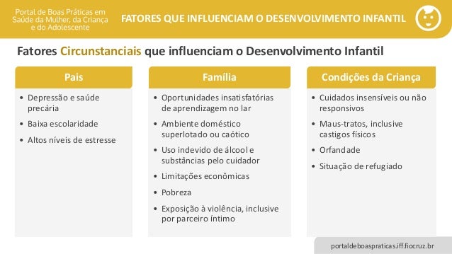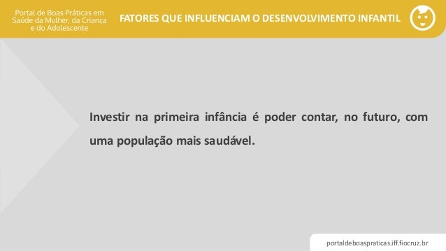 O que dizem as pesquisas. FATORES QUE INFLUENCIAM O DESENVOLVIMENTO INFANTIL portaldeboaspraticasifffiocruzbr Fatores Circunstanciais que influenciam o Desenvolvimento Infantil Exposição Ambiental ao Longo da Vida Metais pesados chumbo e mercúrio Toxinas ambientais arsênico desreguladores endócrinos pesticidas bifelinas policloradas Poluição. é a carga genética do indivíduo que será capaz de estabelecer a sua potencial que poderá ou não se desenvolverExemplo.