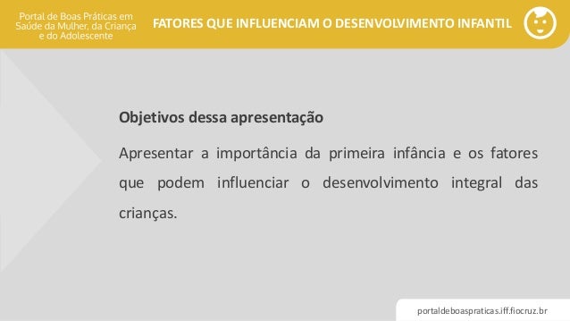Promoção e acompanhamento do crescimento e do desenvolvimento integral. Home Page Quais São Os Fatores Que Influenciam O Desenvolvimento Infantil Na Psicologia. Isso pode depender da qualidade do ensino-aprendizagem e de como a criança está sendo exposta às influencias e estímulos externos.